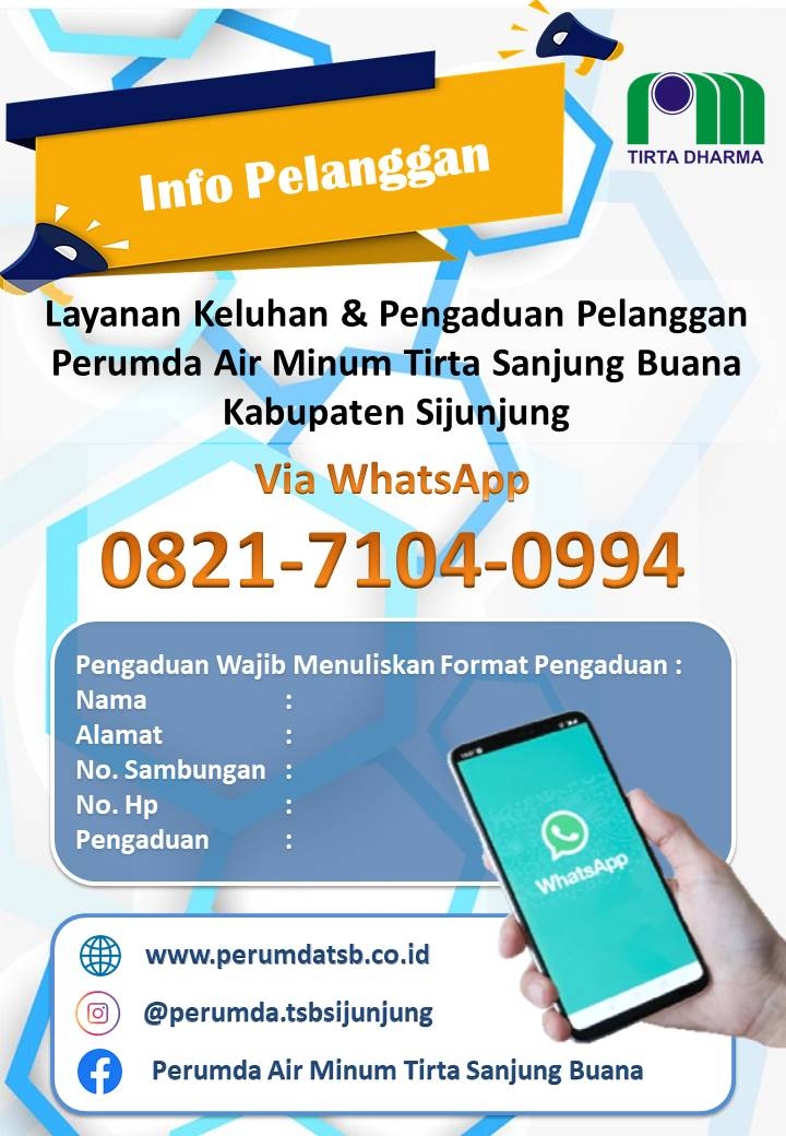 Kabar Gembira untuk Pelanggan Perumda Air Minum Tirta Sanjung Buana Untuk Segala bentuk Pengaduan Pelanggan sudah bisa dilakukan Via Aplikasi WhatsApp, pelanggan Perumda Air Minum Tirta Sanjung Buana bisa menghubungi nomor 0821-7104-0994.. Wassalam, Terima Kasih